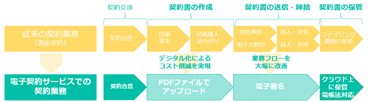 代表的なメリットとしては、「契約業務の効率化」と「コストの削減」 がございます。