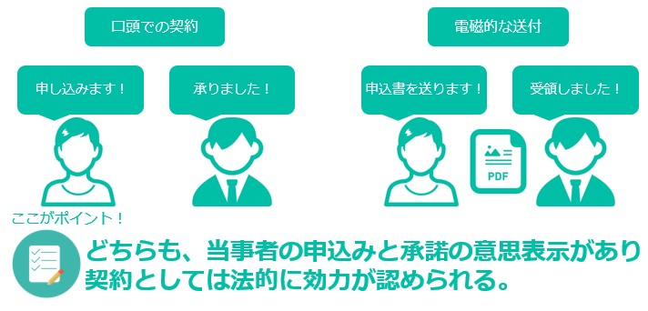 すなわち、書面の有無といった手続きや形式ではなく、契約における申込みとその承諾の有無が重要 となります。