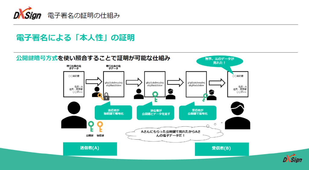 電子署名が法的効力を担保する仕組みを図で解説します。